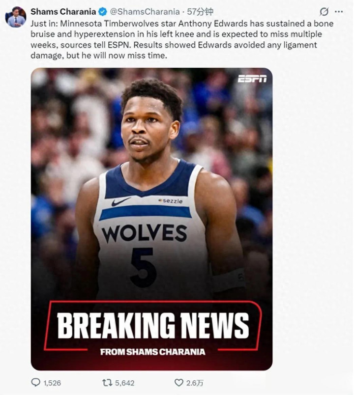 皇冠体育最新网址博彩导航源码下载北京时间4月27日凌晨,据NBA名记Shams报道林州市焱火体育,爱德华兹确诊左膝骨挫伤和过度伸展,将缺席数周!森林狼和掘金的系列赛最晚5月3日结束(G7),也就是一周之后,华子肯定赶不上了。另一个森林狼球员迪温琴佐,因跟腱撕裂赛季报销。